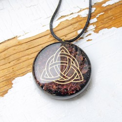 Orgonite necklace with garnet and black tourmaline crystals, with triquetra symbol.
