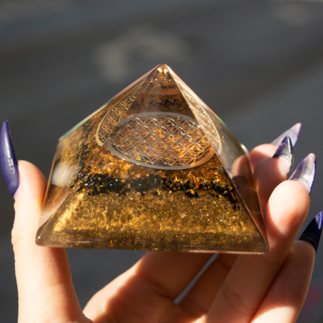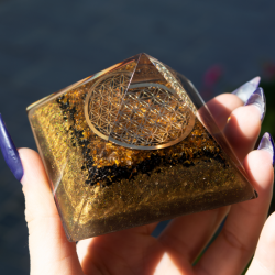 Orgonite pyramid with tigers eye crystal and flower of life symbol.