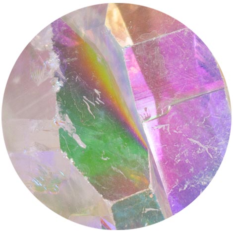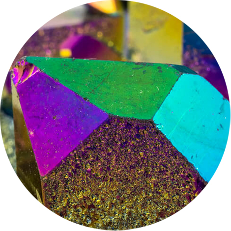 MAVRIČNA AQUA AURA Kremen (SiO₂) + titan (Ti) Imenujemo jo tudi »kamen univerzalne svetlobe«. Nastane tako, da se kristalu kamene strele doda titan. Mavrične barve ujete v kamnu aktivirajo, uravnotežijo in očistijo vse višje čakre. Prav tako ojačajo energije, ki krepijo ustvarjalnost in psihične moči. |