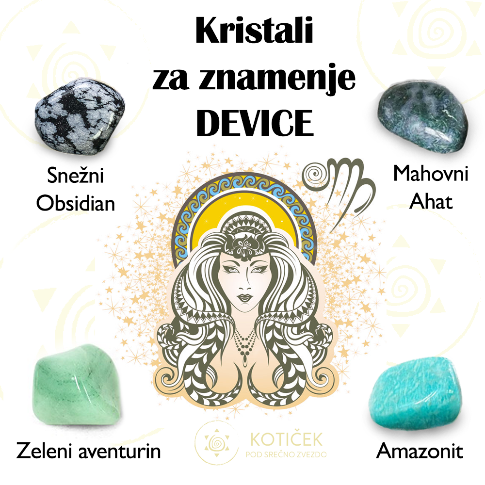 Ljudje v znamenju device so pogosto preveč napeti, perfekcionistični in kritični do sebe. Zaradi svoje izrazite natančnosti se lahko preveč posvečajo podrobnostim s čemer zelo hitro zaidejo stran od bistva. Prav zato jim lahko pomaga tudi snežni obsidian, ki odlično sprošča nepotrebne in stresne misli ter spodbuja pozitivnost. Do sebe kritične device prav tako uči lažjega sprejemanja njihovih napak ter odkrivanja lepot vsakdanjega življenja.
