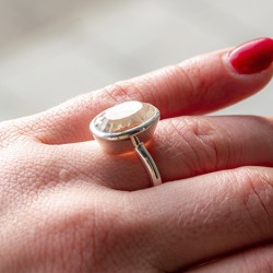 Prstan je izdelan iz visokokakovostnega srebra, ki se popolno zlije s svetlimi odsevi belega topaza. Natančno brušenje omogoča, da kristal čudovito lovi svetlobo in ustvari bleščeč efekt, ki nežno poudari roko. Beli topaz simbolizira jasnost misli, iskrenost in notranji mir, zato je ta prstan tudi izjemno lepo simbolično darilo.