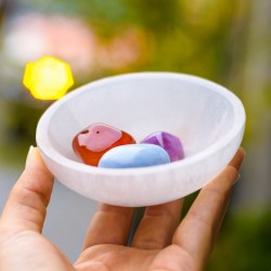 Selenit skodelica se uporablja za čiščenje kristalov. Kristale čez noč pustimo v skodelici in zjutraj so že očiščeni.